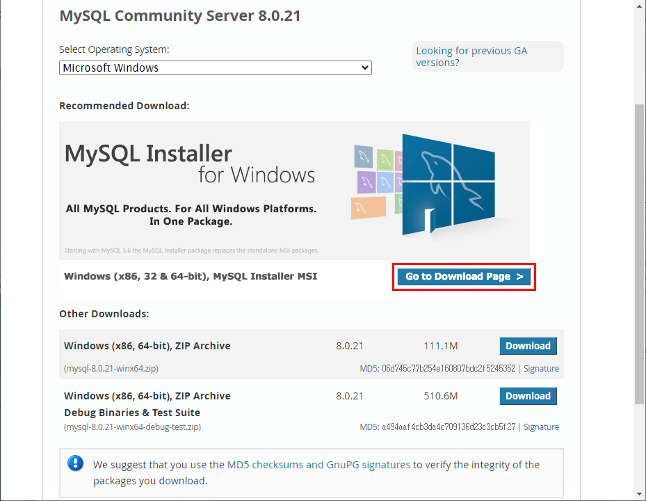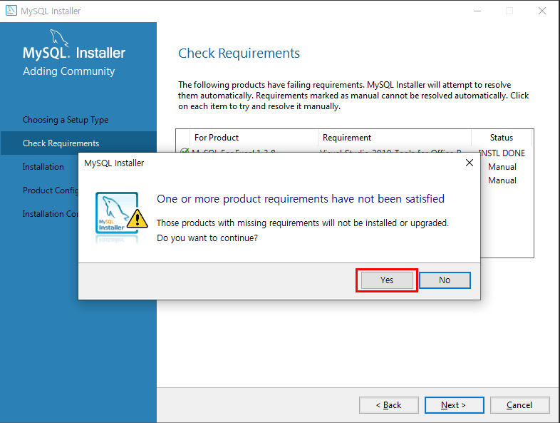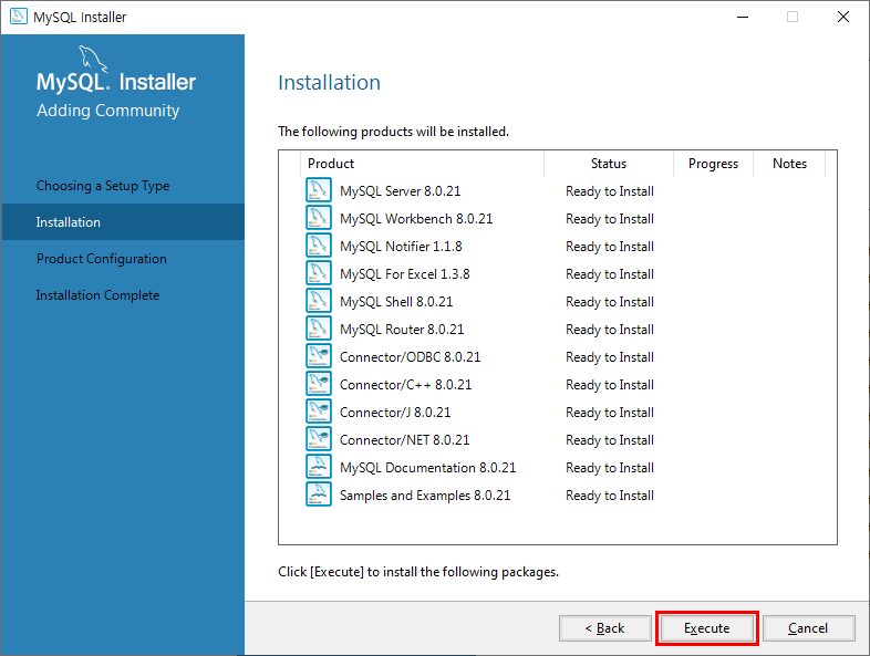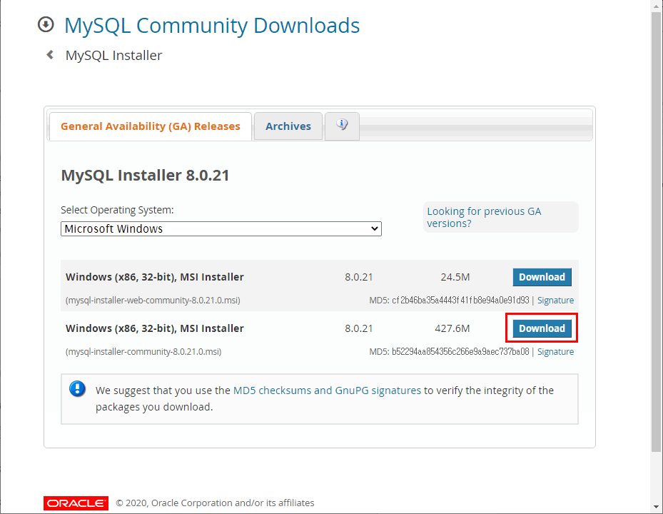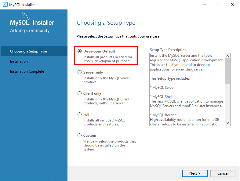 mysql-installer-community-8.0.21.0.msi 실행시켜 설치를 진행한다.