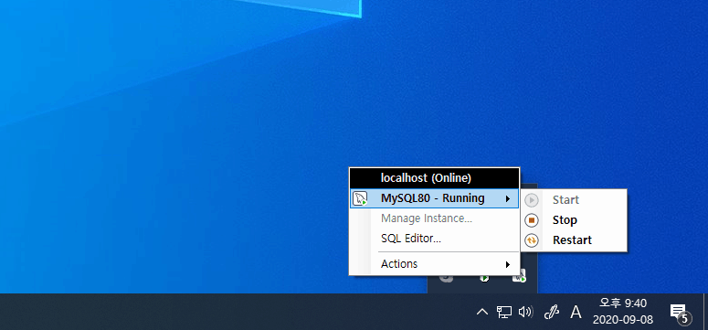컴퓨터 우측하단 MySQL 아이콘을 마우스 오른쪽 버튼을 클릭하여 Start, Stop, Restart를 하면된다.