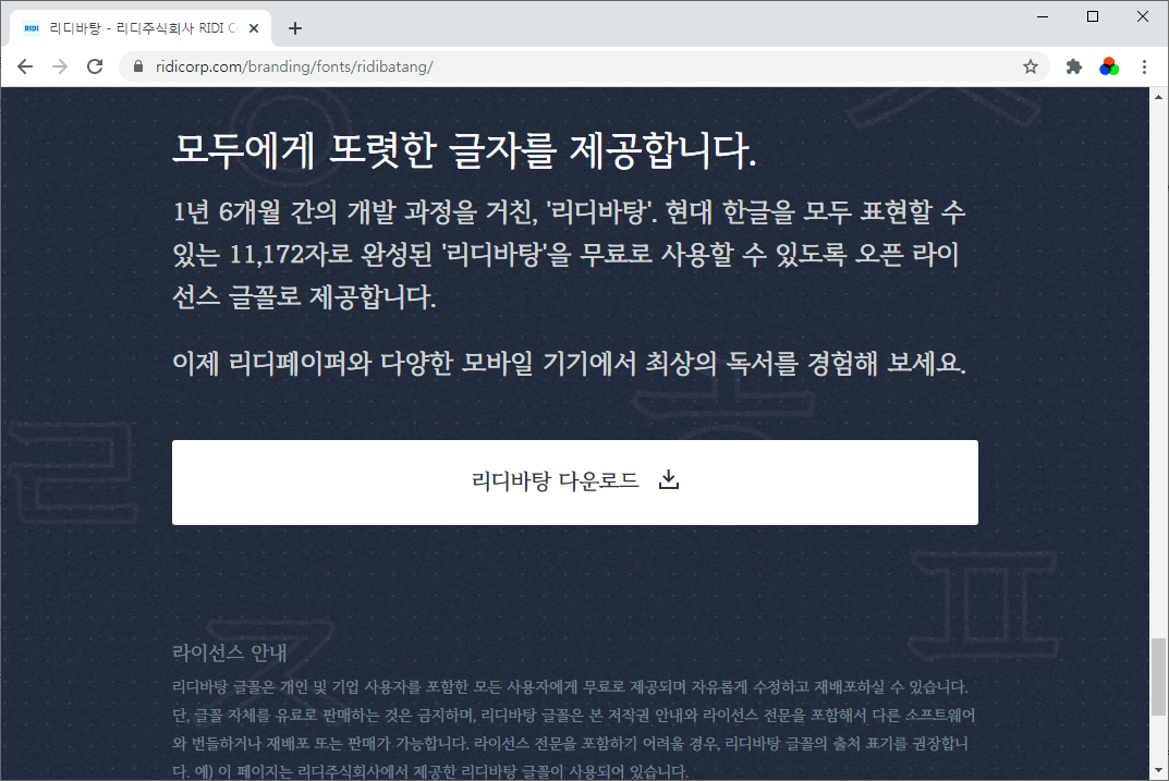 라이선스 전문을 포함하기 어려울 경우, 리디바탕 글꼴의 출처 표기를 권장합니다. 예) 이 페이지는 리디주식회사에서 제공한 리디바탕 글꼴이 사용되어 있습니다.