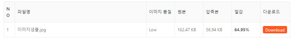 Low를 선택하면 가장 많이 용량을 줄일 수 있다. 줄어든 이미지는 '다운로드' 버튼을 눌러 다운 받는다.