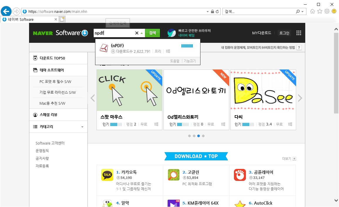 난 다운로드 받기 위해서 네이버 소프트웨어 자료실(software.naver.com/main.nhn)에 들어가 검색에 npdf 로 찾아서 다운로드 화면으로 이동한다.