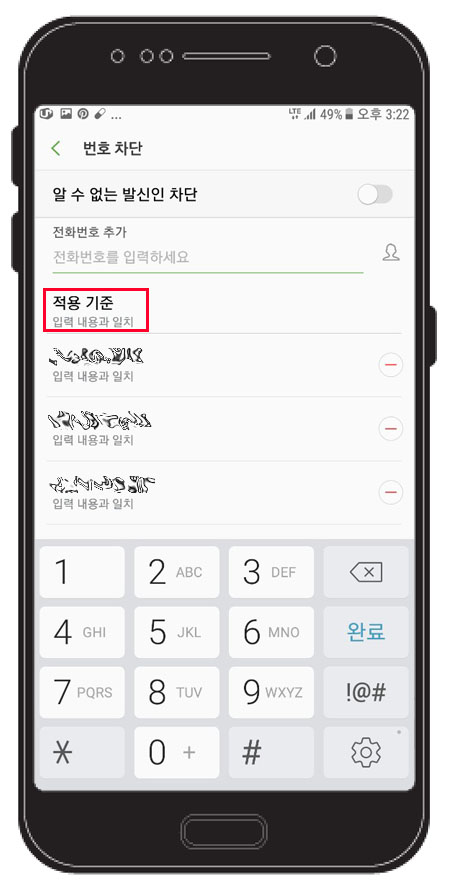 번호 차단 설정화면에서 먼저 '적용 기준'을 선택