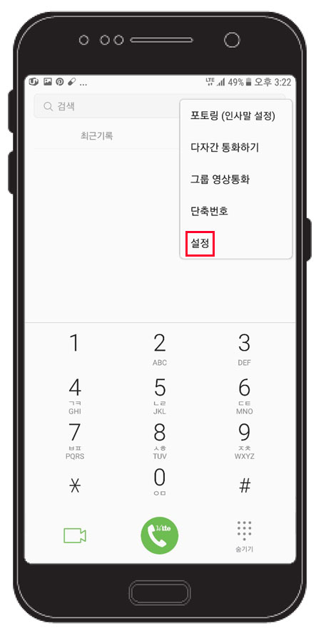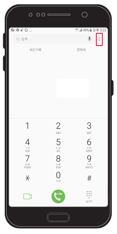 우선 스마트폰에 전화 걸기로 들어가서 아래 이미지처럼 우측 상단에 점 세개 버튼을 누른다.