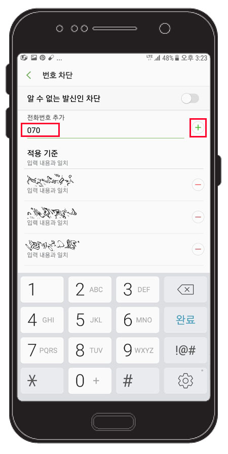 기준을 설정하고 전화번호 추가란에 '070'을 입력하고 우측에 '+' 버튼을 누른다.