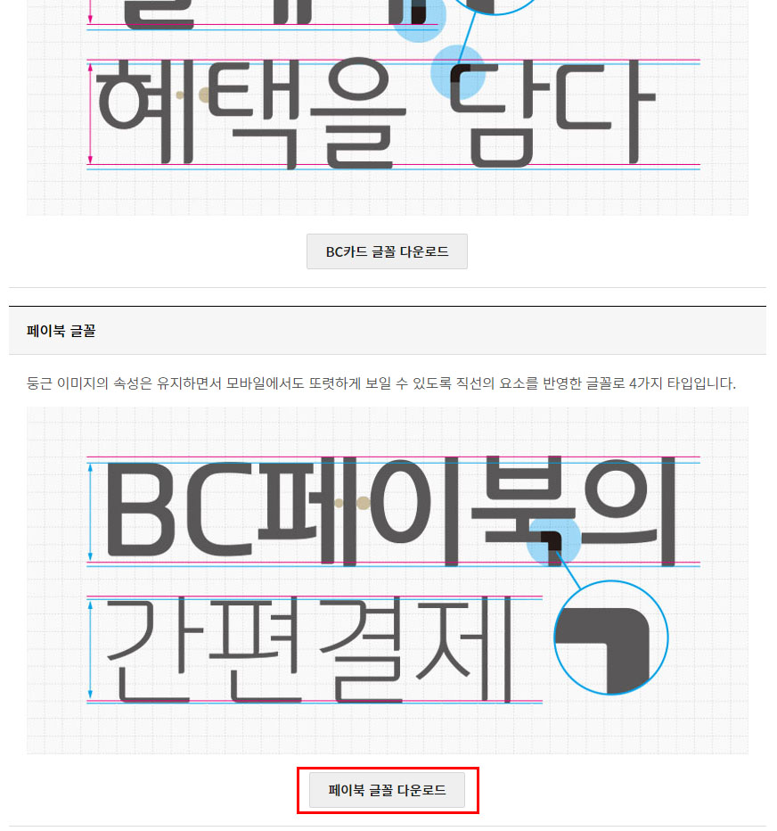 BC카드에서 만든 폰트로서 둥근 이미지의 속성은 유지 하면서 또렷하게 보일 수 있도록 직선의 요소를 반영한 글꼴(폰트) 4가지 타입이다. BC카드 글꼴도 같은 다운로드 페이지 있으므로 잘 활용하면 좋을 것 같다.