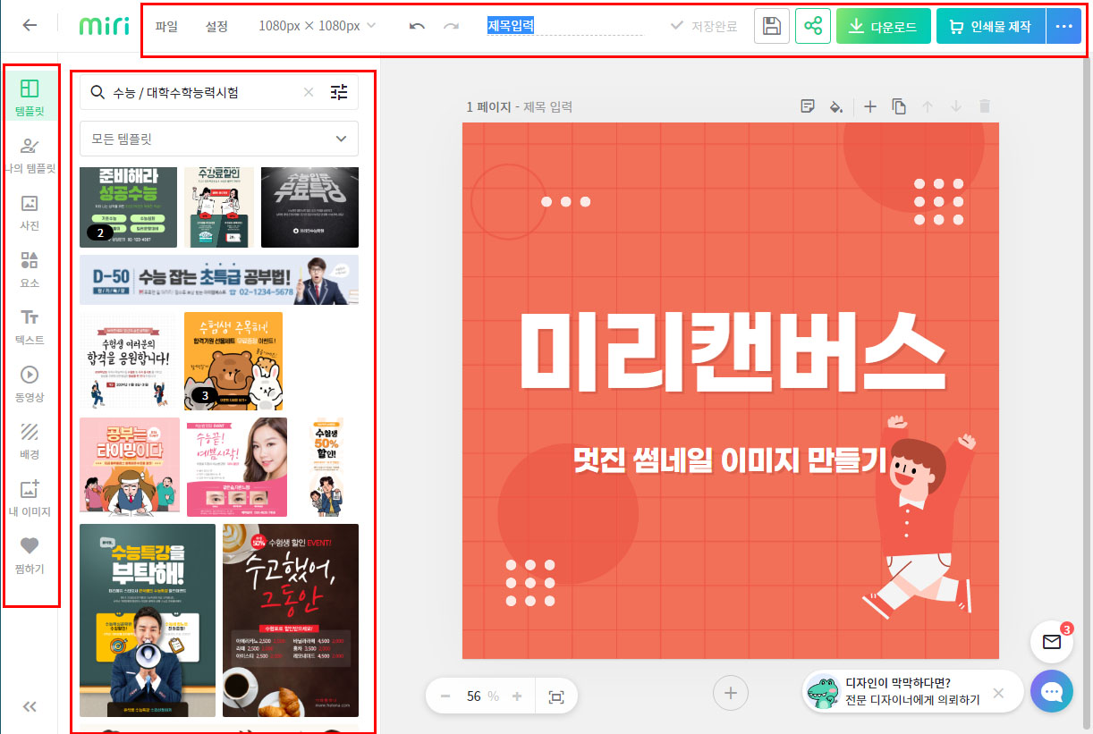 상단에는 사이즈, 파일이름, 저장, 다운로드 등 기본 기능이 배열되어 있고, 좌측으로는 템플릿을 다시 선택하거나 사진을 선택하거나 텍스트를 선택할 수 있는 편집에 필요한 기능으로 배치되어 있다.