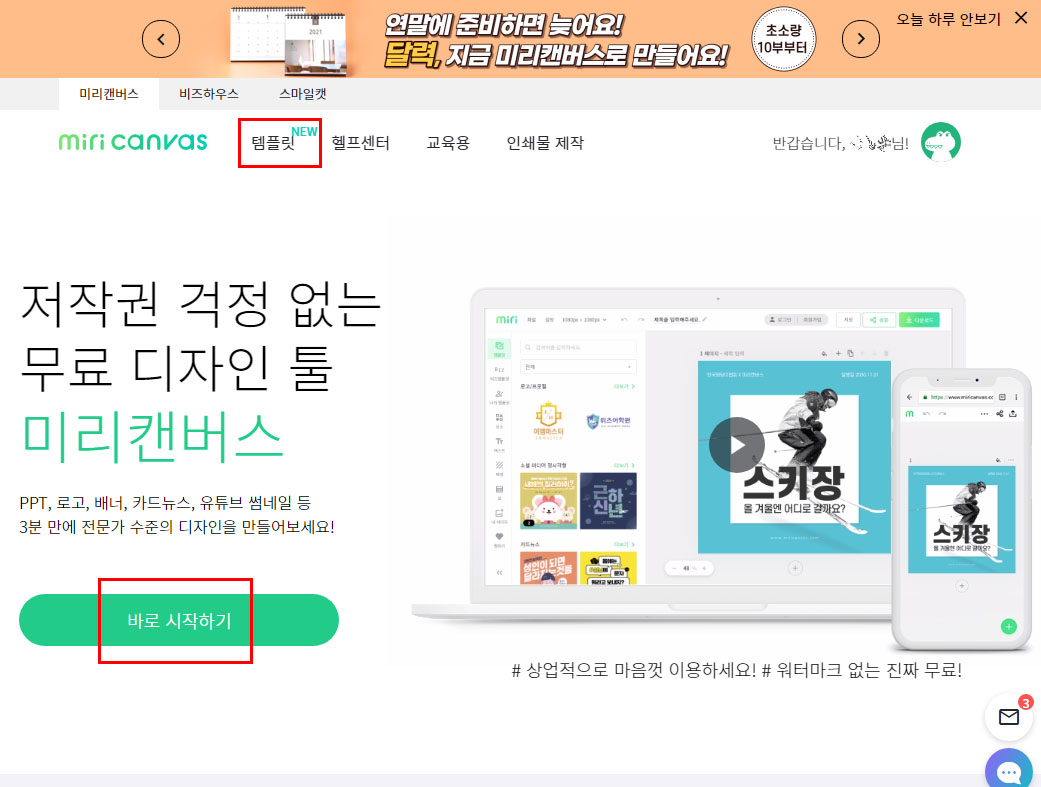 홈페이지에 접속하여 회원가입을 하고, 로그인 후 사이트 홈에서 상단메뉴에서 '템플릿'을 선택하여 각 카테고리별로 정리된 리스트에서 마음에 드는 선택하여 들어가거나, 메인에서 '바로 시작하기'를 눌러 편집화면으로 바로 접속한다.
