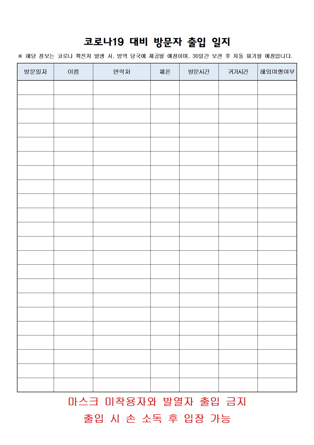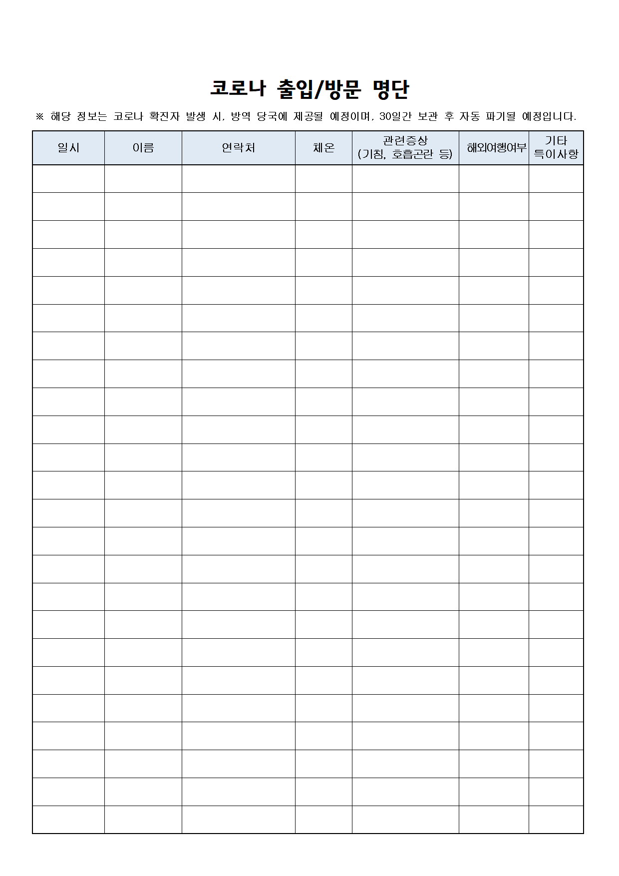 마스크와 더불어 또 하나의 작은 불편함이지만, 업주분들의 안내에 따라 발열체크 및 명부 작성에 적극적으로 임해야겠다. 위 양식은 한글(hwp)와 PDF파일이며 바로 다운로드 받아 출력해서 이용하면 된다.