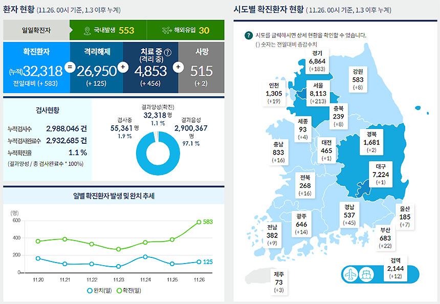 코로나19 확산세가 심상치 않은 양상으로 흐르고 있다. 26일 신규 확진자는 25일보다 201명에서 폭증하여 583명에 이르고 있어 지난 3월6일 518명이 나온 이후 약 8개월 만이다. 신규확진자 583명 가운데 국내 지역 553명, 해외 입국자 30명이고 교회, 군부대, 사우나, 유흥주점, 학교, 교도소, 각종 모임 등 다양한 일상 공간을 매개로 전국 곳곳에서 동시다발적으로 터져 나오고 있다.