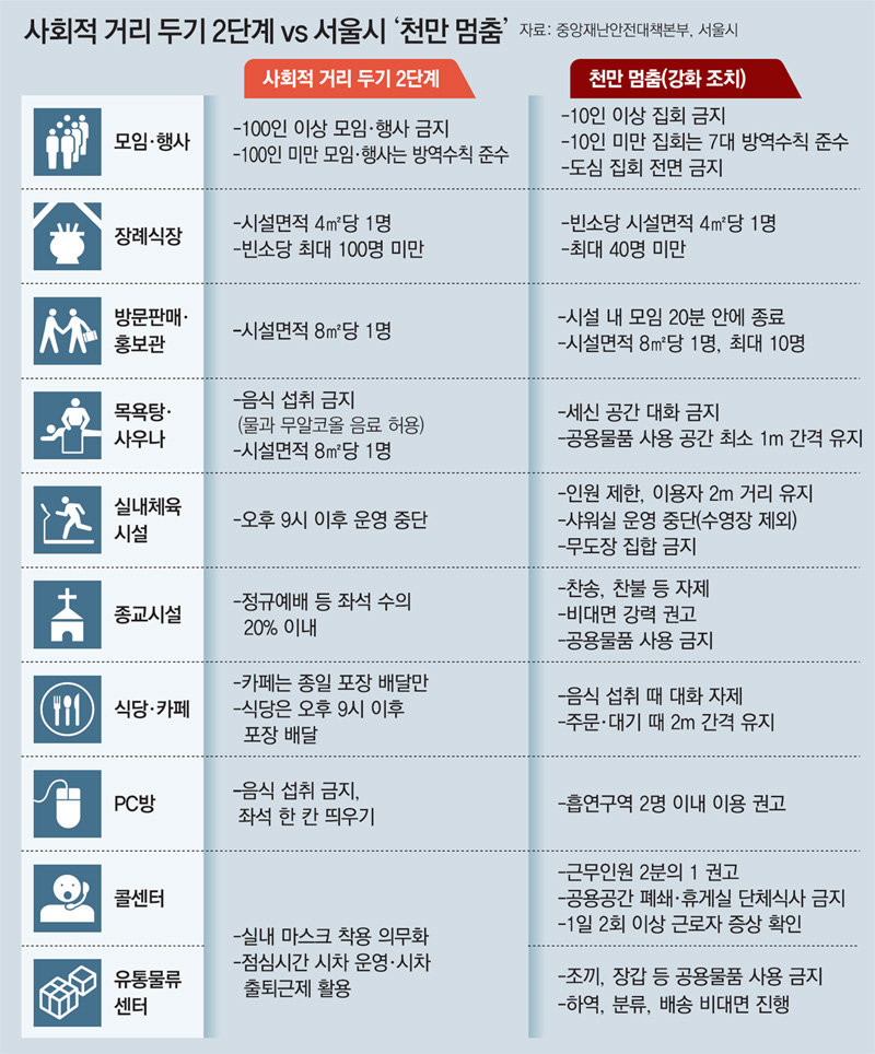유흥시설 5종 집합금지 이외 시설은 21시 이후 운영 중단 등 제한 강화, 위반시 스트라이크아웃제 |