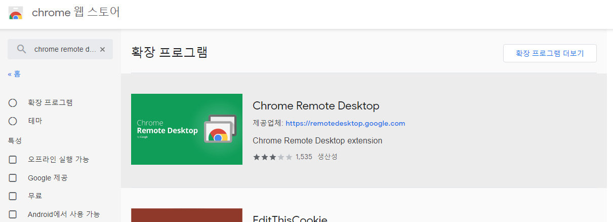 2. 컴퓨터 크롬브라우저에서 '웹스토어'에 접속하여 'Chrome Remote Desktop'을 검색하여 확장 프로그램에 설치한다.