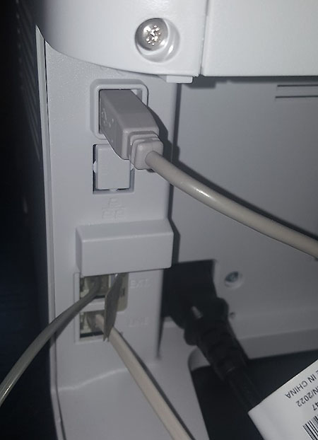 후면에 USB 케이블2.0과 전화선 연결부, 전원 포트가 보인다.