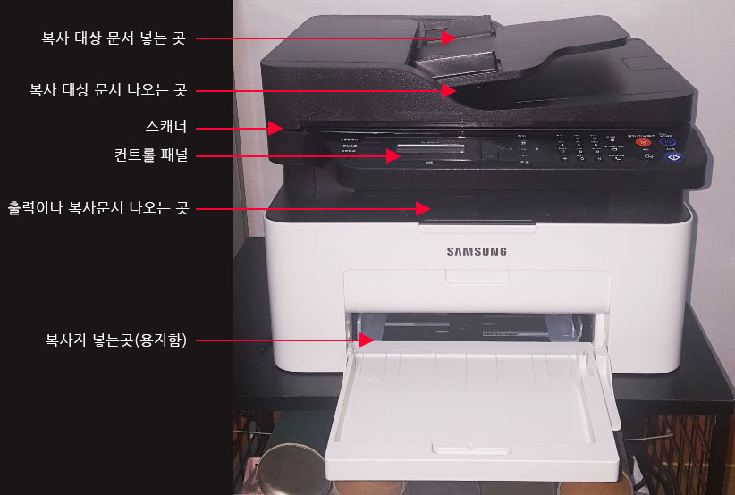스캐너가 있고, 컨트롤 패널, 출력문서 나오는 곳, 용지함이 차례대로 있다.
