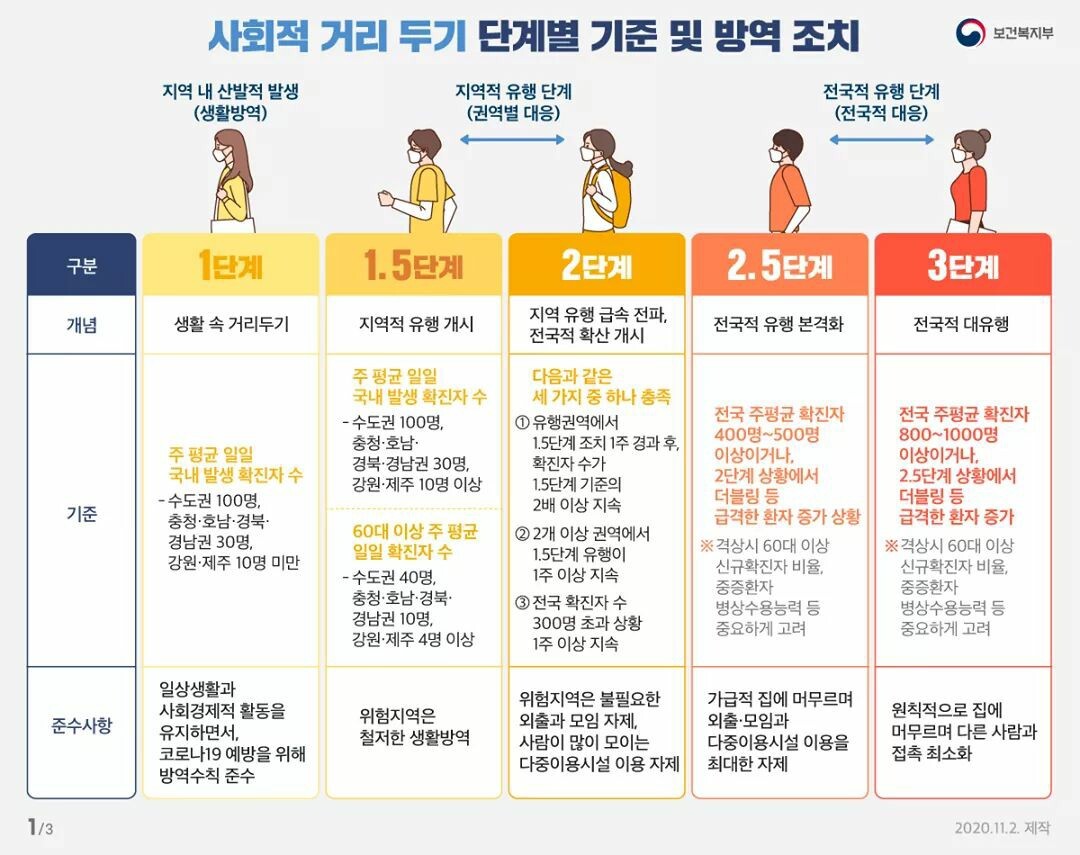 정부는 현행 수도권 2.5단계와 비수도권 2단계가 적용되는 3주 안에 확산세를 꺾어야 한다고 강조하며 3단계는 사회활동의 전면제한이라는 거리두기 최종 단계인 만큼 어마어마하게 큰 사회적 영향을 끼치게 되고 많은 영세 자영업자와 소상공인 피해를 야기하는 전면 제한 조치가 함께 동반된다고 설명했다.