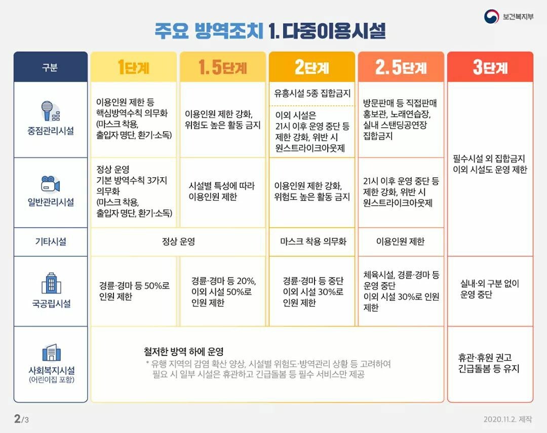 시설별 특성에 따라 이용인원 제한 | 이용인원 제한 강화, 위험도 높은 활동 금지 | 21시 이후 운영 중단 등 제한 강화, 위반시 원스트라이크아웃제 |