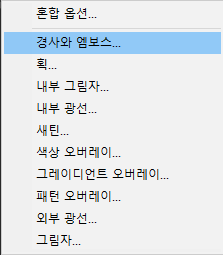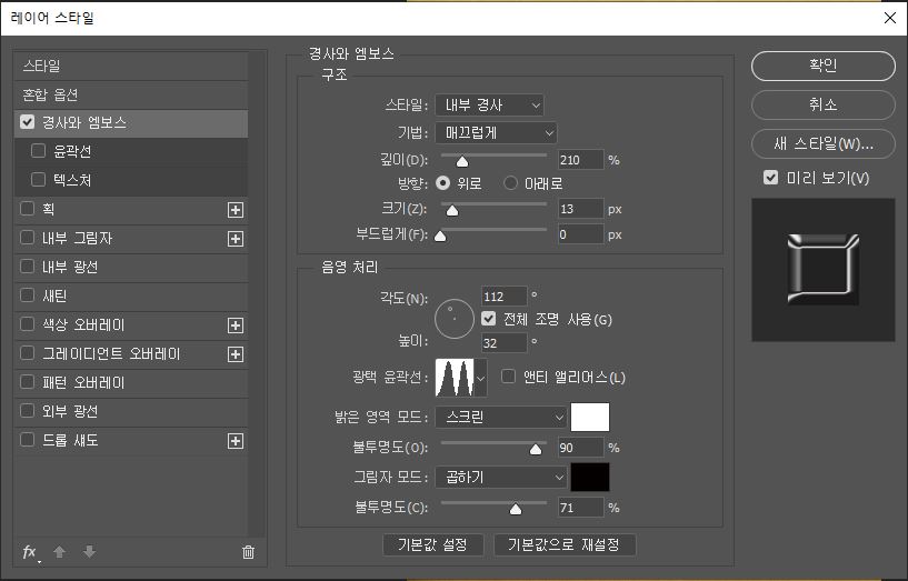 경사와 엠보스의 스타일, 깊이, 크기, 부드럽게, 각도 광택 윤곽선 등을 조절한다.