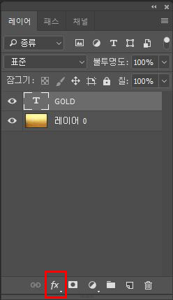 골드 색상의 텍스트를 입력하고 레이어 하단에 레이어 스타일을 클릭한다.