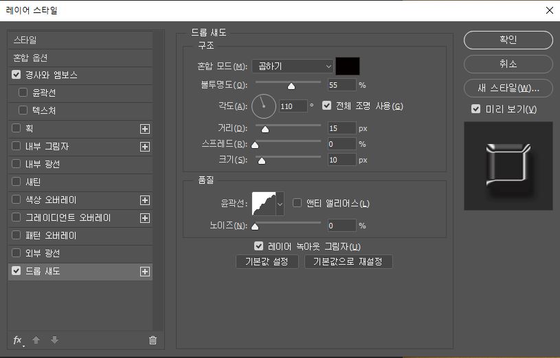 다음은 약간의 돌출된 느낌이 나도록 '드롭 섀도'도 줘 본다.