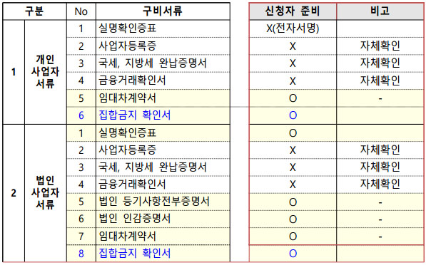 공통 구비서류 외에 개인, 법인사업자 공통으로 지자체·교육청에서 발급한 '집합금지 확인서' 필요