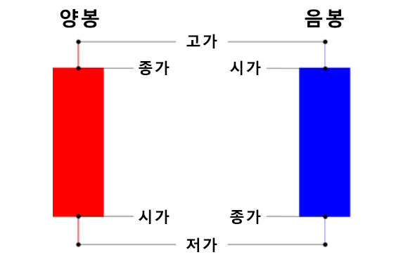 양봉은 상승, 음봉은 하락을 말하며, 시가와 종가를 나타내는 것은 굵은 막대입니다.
