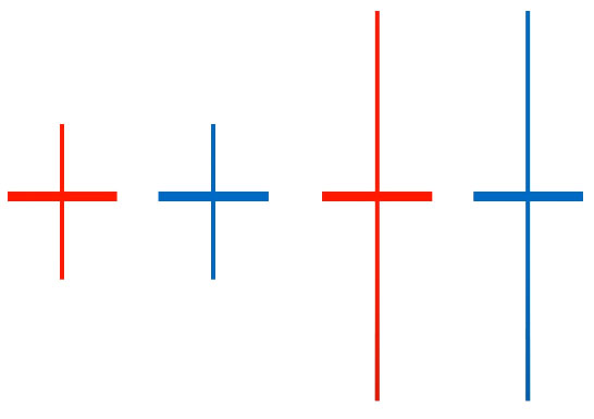 위의 그림은 팽이형 캔들이고, 굵은 막대의 끝과 실선 끝의 차이가 길면 길수록 시가 또는 종가가 고가 혹은 저가와의 차가 크다고 보며 그날의 장은 굉장히 활발했다고 볼수 있다네요.