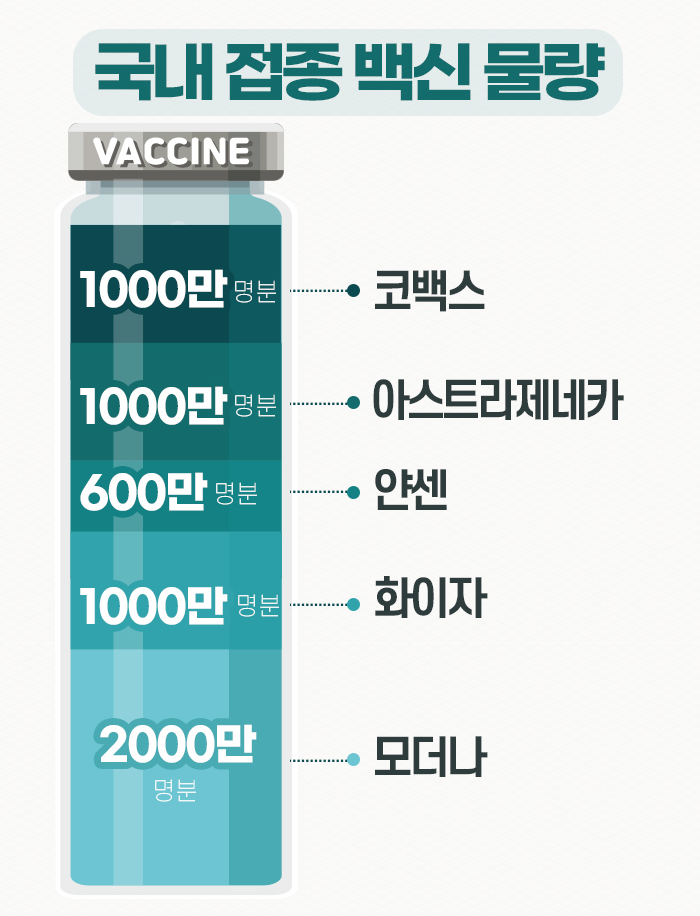 1분기는 아스트라제네카, 2분기에는 얀센, 모더나, 3분기에는 화이자 등 단계적으로 도입될 예정이고, 아스타라제네카는 2월말에 식품의약품 안전처 허가와 국가출하 승인된 이후 150만회분이 우선 공급될 예정입니다.