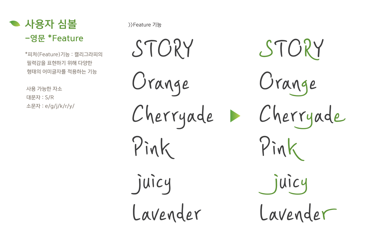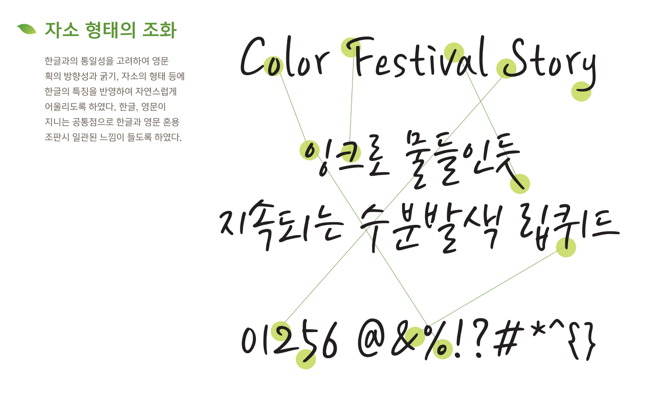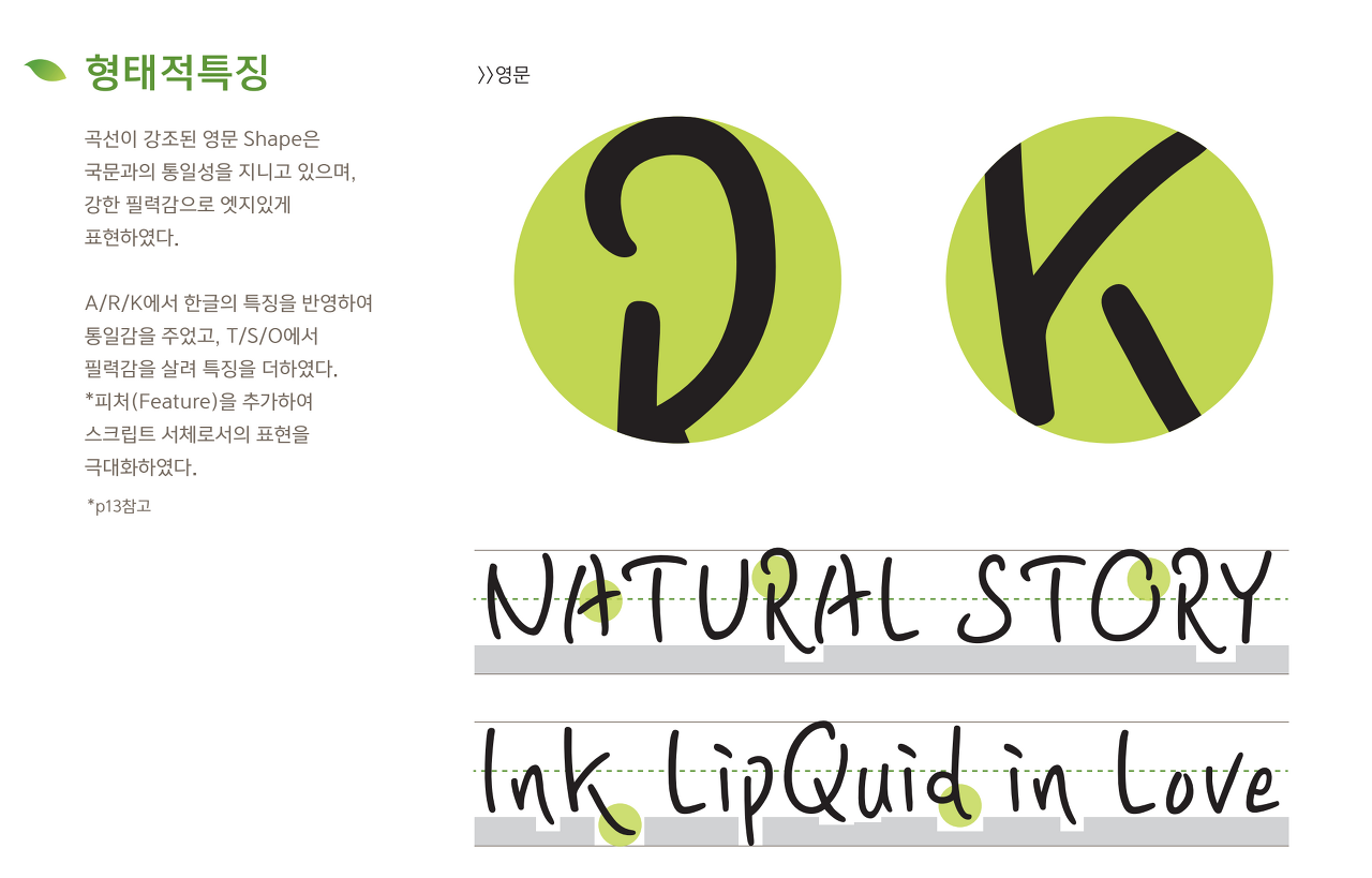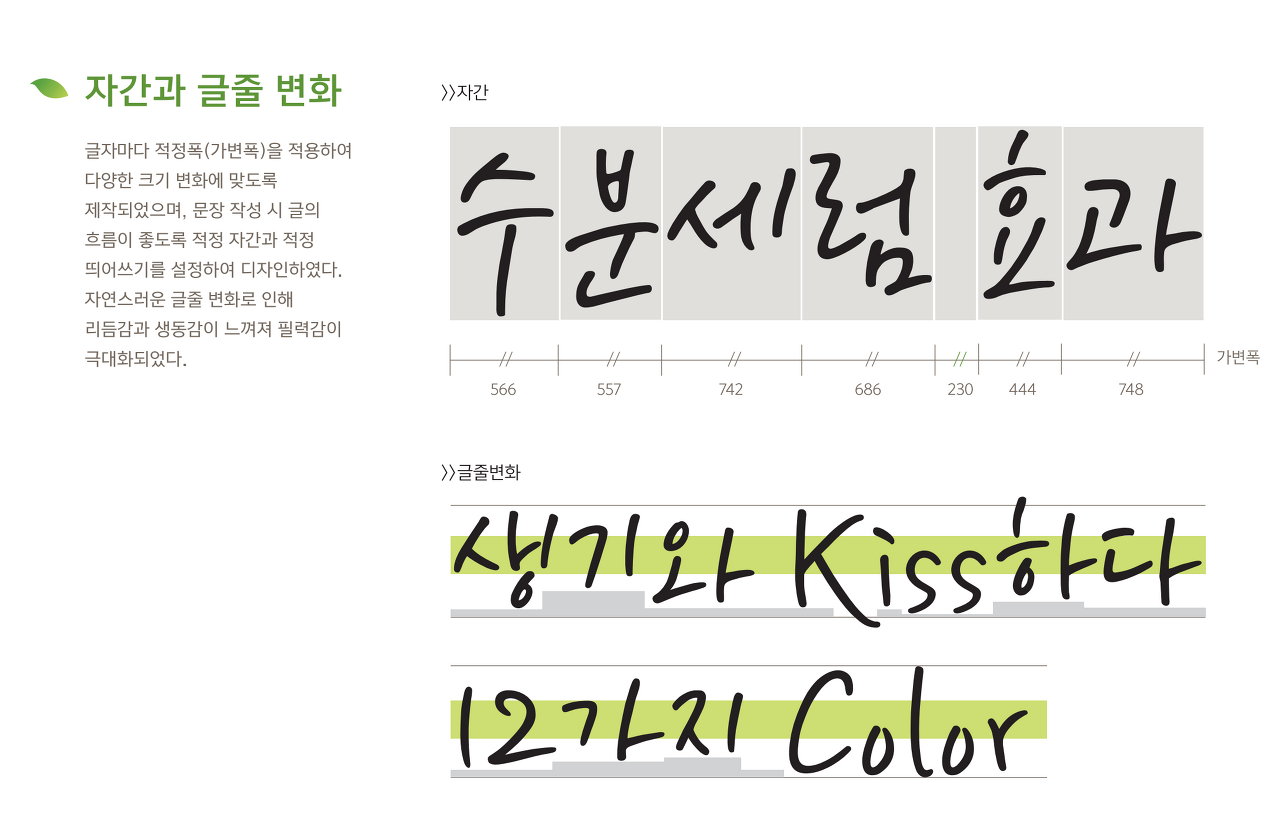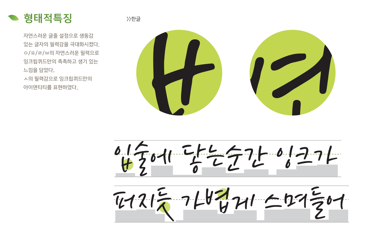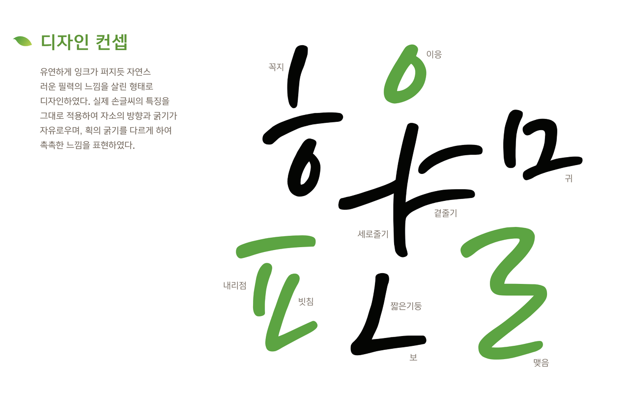 유연하게 잉크가 퍼지듯 자연스러운 필력의 느낌을 살린 형태로 디자인 하였다. 실제 손글씨의 특징을 그대로 적용하여 자소의 방향과 굵기가 자유로우며, 획의 굵기를 다르게 하여 촉촉한 느낌을 표현하였다.