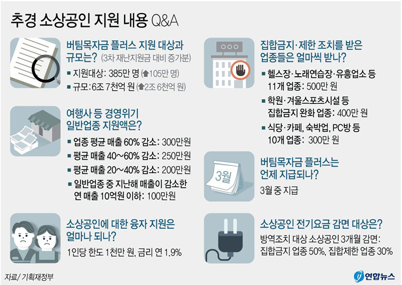 매출이 감소한 소상공인, 소기업 385만개에 대해 최대 500만원 지원