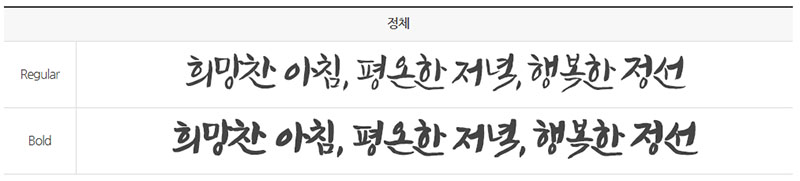 네모틀의 구조안에서도 자소 형태에 변화를 주어 리듬감을 형성하고 특히 종성 'ㄴ'에서의 형태 변화로 마치 춤사위에서 느껴지는 한국적인 선의 느낌을 주는 서체입니다.