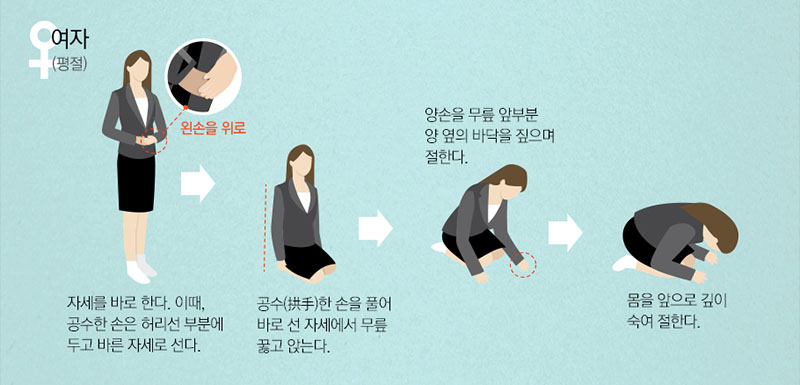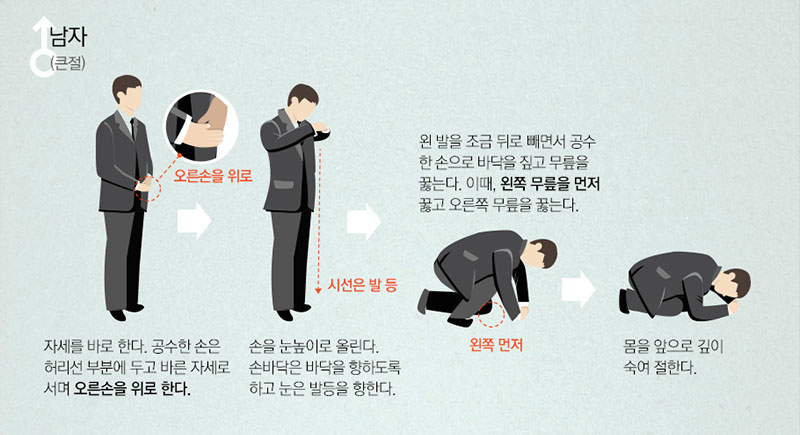 남자는 오른손, 여자는 왼손이 위로 가게 절을 하고 (흉사공수법), 다리를 다치거나 몸이 아파서 절을 못 드리는 분들은 절을 하지 않고 묵념으로 대신합니다.