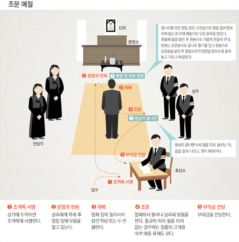가장 일반적인 조문 방식으로 우리나라에서 종교가 없는 사람들은 한국 고유의 장례 문화인 유교 방식으로 장례를 치르며 개신교를 제외한 대부분의 종교가 이를 인정하고 있습니다.