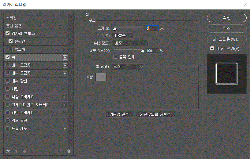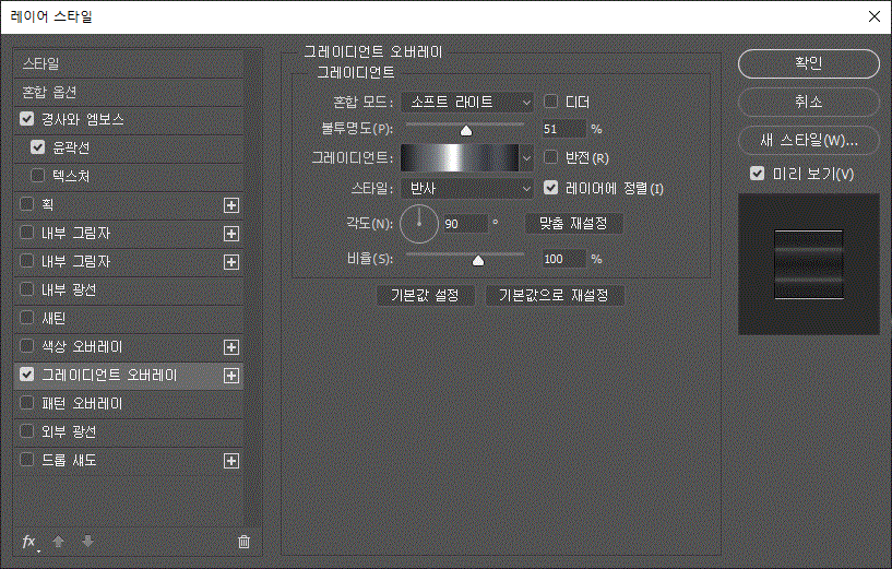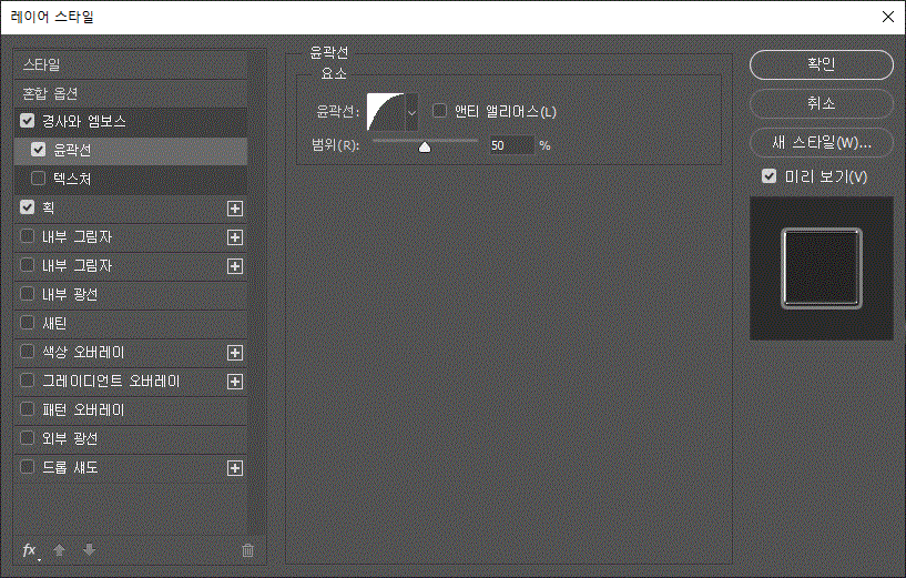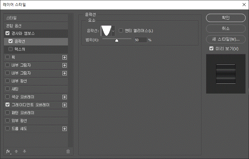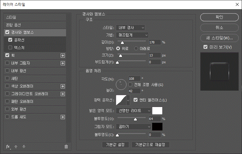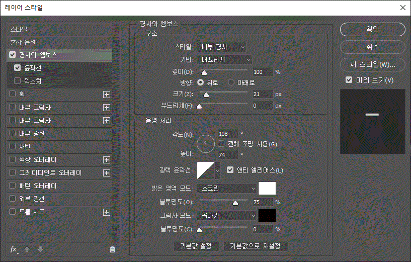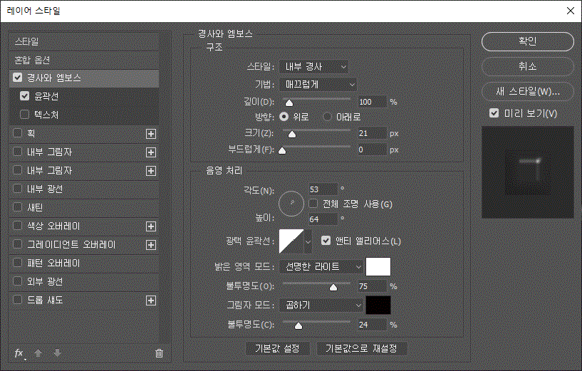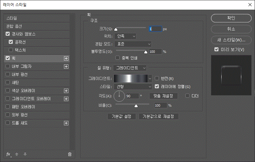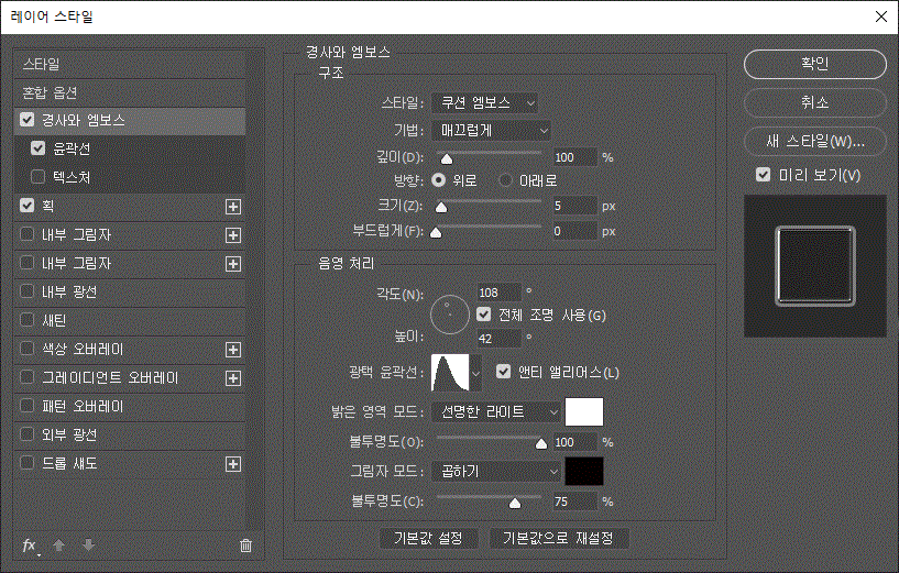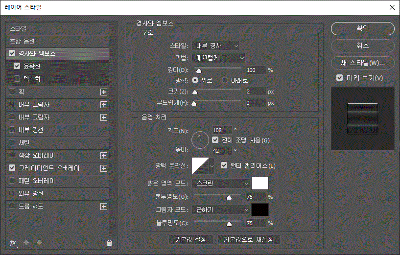 레이어 스타일에 '경사와 엠보스', '경사와 엠보스/윤곽선', '획' 효과를 주었다.