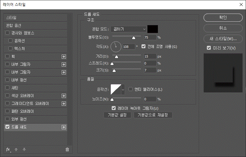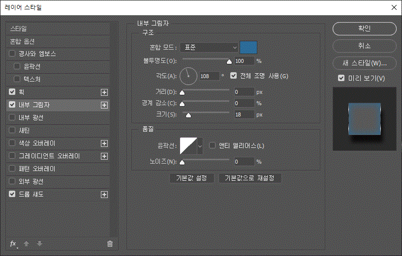 레이어 스타일에 '획', '내부 그림자', '드롭섀도' 효과를 주었다.
