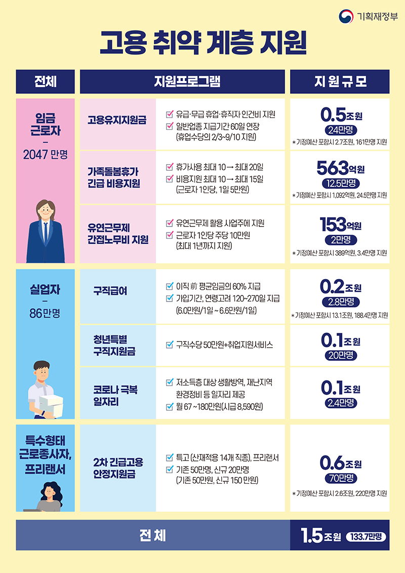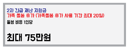 | 가족돌봄 휴가비용 긴급지원 | 가족돌봄 휴가 사용 기간 최대 10일에서 20일로 확대 기존에 10일 다 사용하신 분들 최대 10일 추가 사용기간 확대에 따라 정부의 돌봄비용 지원 기간도 최대 10일에서 15일로 확대, 1인당 최대 75만원 추가 지원 |