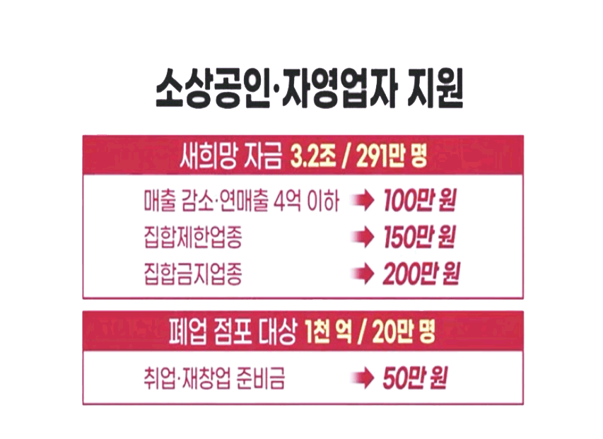 | 집합금지업종(전국 소상공인) | 주점, 뷔페, 노래연습장, 실내 집단운동, 실내 공연장, 방문판매, PC방, 유통물류센터, 대형 학원(300인 이상) | 200만원 |