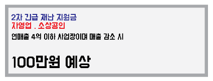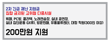 | 집합금지업종(수도권) | 헬스장, 당구장, 골프연습장, 학원(10인 이상), 독서실, 스터디카페 등 | 200만원 |