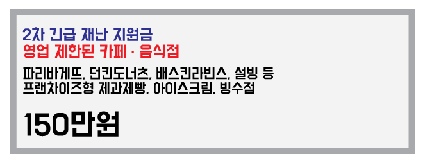 | 집합제한업종 | 파리바게뜨, 던킨도너츠, 배스킨라빈스, 설빙 등 프랜차이즈형 매장 | 150만원 |