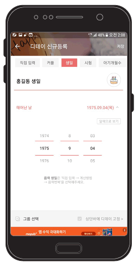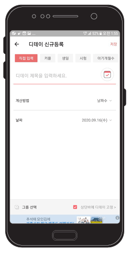 디데이등록하기를 클릭하면 위와같이 '직접입력, 커플, 생일, 시험, 아기개월수, 다이어트, 금연, 음력생일, 수능, 여행, 결혼기념일, 월급날, 크리스마스, 입대, 꽃신 신는날, 입덕, 방탄소년단 데뷔, 엑소 데뷔, 워너원 데뷔, 추모' 등 자주 사용하는 단어는 쉽게 등록하도록 해놓은 것 같다.