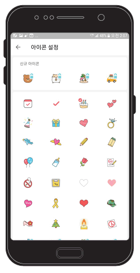 난 생일을 선택하고 입력해 본다. 입력시 이름적는 난 오른쪽에 아이콘을 클릭하면 더 많은 아이콘도 확인, 선택할 수 있다.