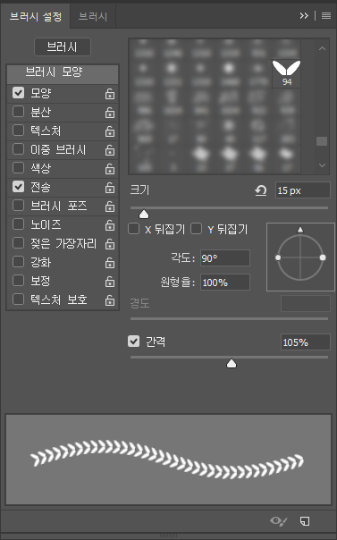 크기가 94 되는 것을 15 픽셀로 바꾸고, 각도 90도, 간격 105%로 설정 후, 좌측 '모양'을 클릭하여 Shape Dynamics 에서 '각도 지터'에 조절을 '방향'으로 지정한다.