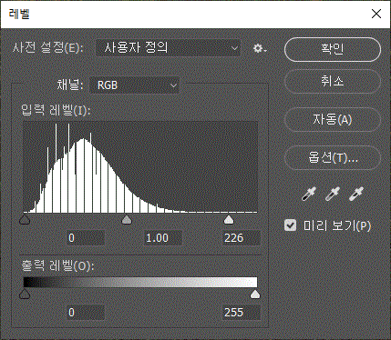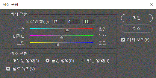 사진의 품질에 따라 다르겠지만, 채도를 높이려고 포토샵 상단 메뉴에서 '이미지/조정/색상균형'을 설정했고, 조금 밝게 하기위해 '이미지/조정/레벨'을 수정했다.
