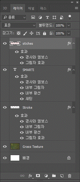 다음 smarti 텍스트레이어를 마우스 오른쪽 버튼으로 클릭하고 '작업패스만들기' 를 선택, 새로운 레이어를 만들고 'stiches'로 이름을 지었다. 전경색 #d5002c 로 설정 포토샵 좌측 툴박스에서 '직접 선택도구'를 선택한 다음 작업문서에서 마우스 오른쪽 버튼을 클릭하고 '패스 획'을 선택 확인한다. 다음과 같이