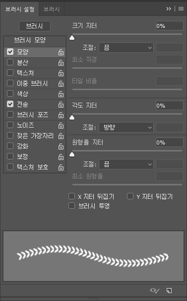 다시 본 작업문서로 돌아가서 브러쉬 패널을 열고 위에서 만든 브러쉬를 선택하고 아래와 같이 설정을 변경한다.