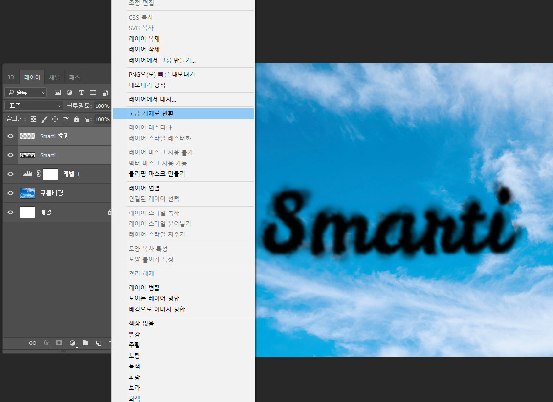 'smarti' 와 'smarti 효과' 레이어를 Ctrl+레이어를 클릭하여 두 레이어를 선택한 후, 마우스 오른쪽 키를 클릭하여 '고급 개체로 변환'을 선택한다.