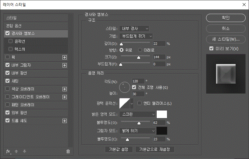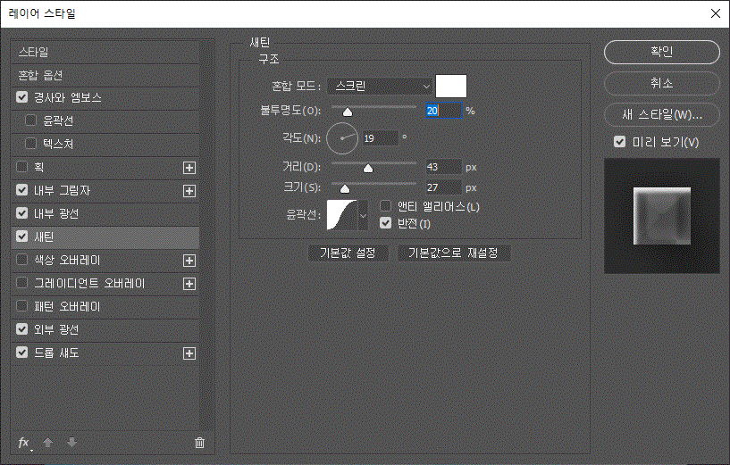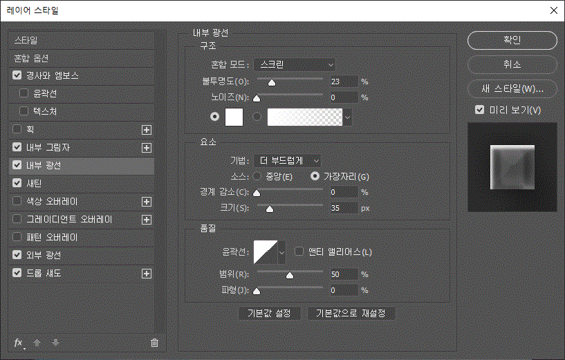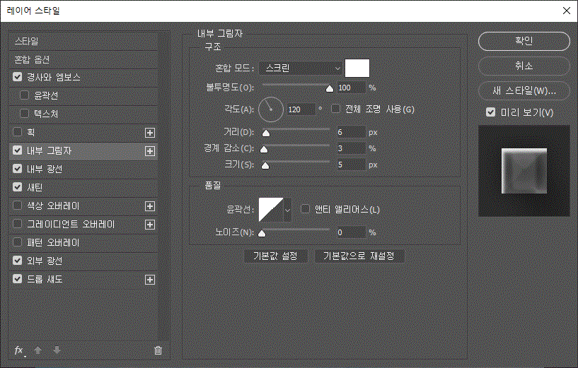 다음으로 전경색을 흰색, 배경색을 검정색으로 지정하고 레이어 스타일을 다음과 같이 준다.