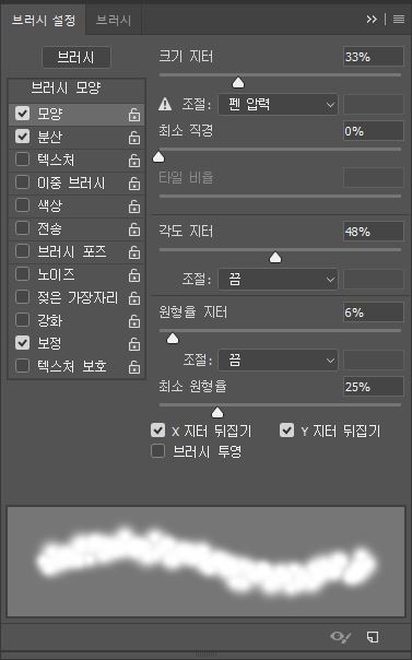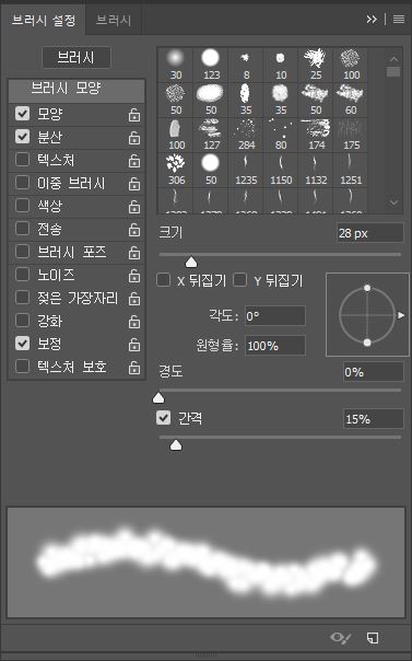기본 끝이 부드러운 원형 브러쉬를 브러쉬 속성창을 열고 다음과 같이 조정한다.