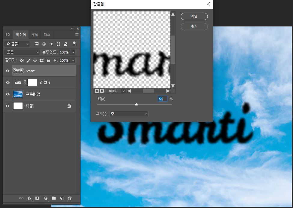 새 레이어를 추가 'smarti 효과' 레이어를 만든고 위에 만들어진 브러쉬를 이용하여 검정색으로 텍스트 가장자리에 불투명도 30% 정도로 구름을 표현한다.