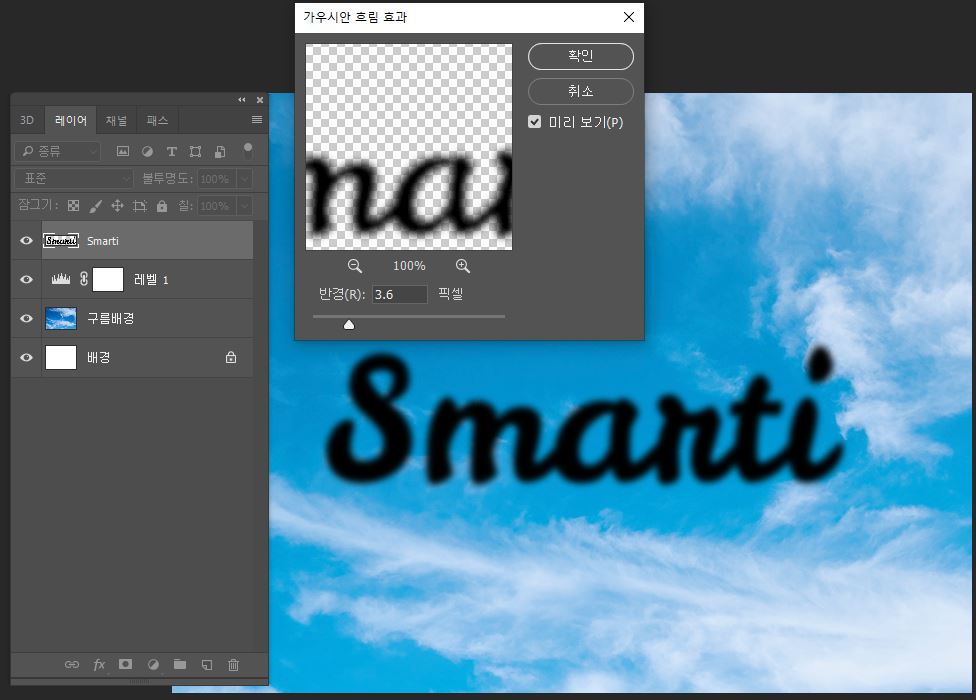 새 레이어에 검정색으로 'Smarti' 텍스트를 추가한다. 레이어에 마우스 오른쪽 버튼을 클릭하여 '문자 래스터화'를 시킨다. '필터/흐림 효과/가우시안 흐림효과'를 다음과 설정한다.
