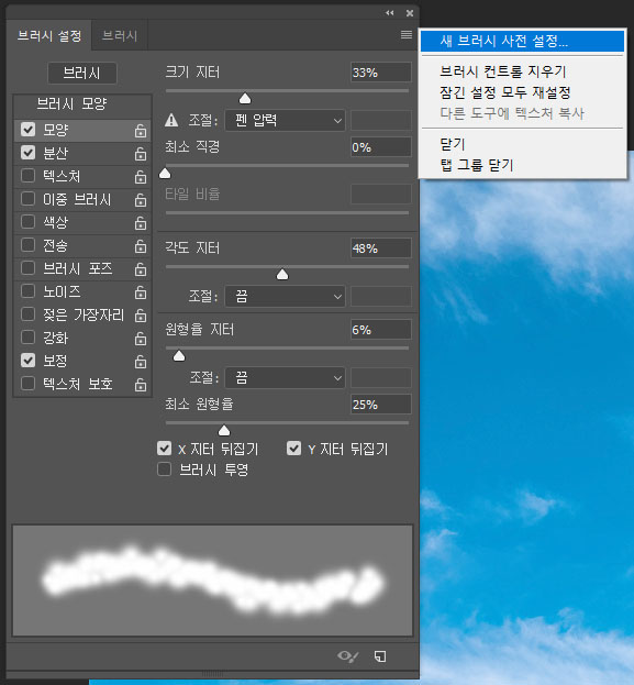 만들어진 브러쉬를 브러쉬 옵션창에서 오른쪽 상단 ▤ 클릭하여 '새 브러시 사전 설정'에서 이름을 clouds brush 짖는다.