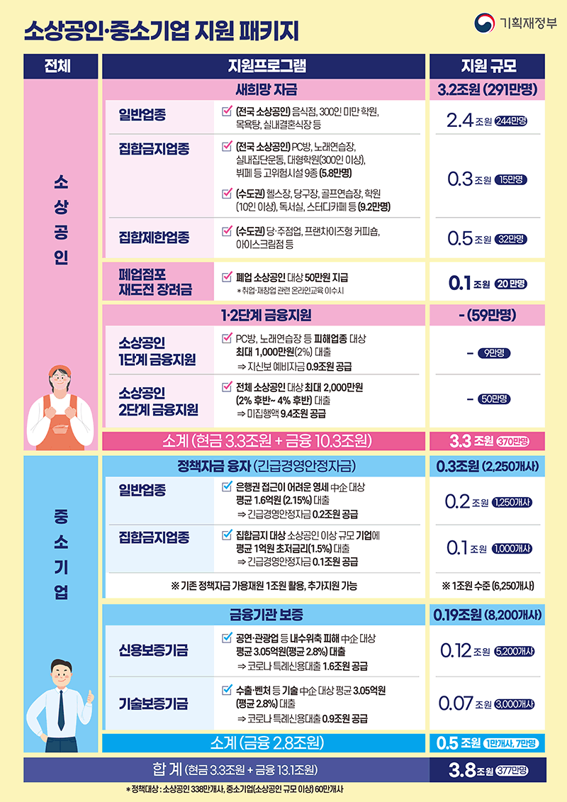 | 집합금지업종(전국 소상공인) | 주점, 뷔페, 노래연습장, 실내 집단운동, 실내 공연장, 방문판매, PC방, 유통물류센터, 대형 학원(300인 이상) | 200만원 |